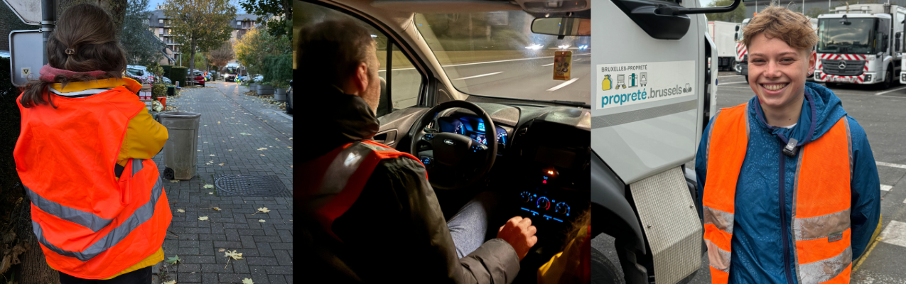 Ik werk als openbare netheidswerker. Mijn job bestaat erin ervoor te zorgen dat de straten van Brussel het hele jaar door schoon en aangenaam blijven. Ik ben gestart bij het vegen, waarbij ik straten en gemeenten schoonmaakte en vuilnisbakken verving. Daarna ben ik doorgegroeid naar de lading, wat betekent dat ik achter de vuilniswagen werk. Samen met een collega halen we de vuilniszakken op van de Brusselaars.