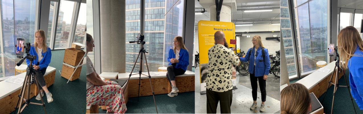 Ik help mijn collega's ook met alles wat met video's te maken heeft, want we maken er heel wat voor onze sociale media en website. Dit doen we vaak in samenwerking met onze gewestelijke partners, zoals Leefmilieu Brussel, Brussel Mobiliteit of BRUGEL. Dat is best leuk, want zo kunnen we onze partners in de schijnwerpers zetten en zijn we aanwezig in het veld.